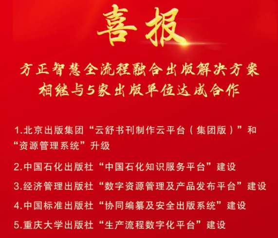 喜報(bào) |“方正智慧全流程融合出版解決方案”相繼與5家出版單位達(dá)成合作!
